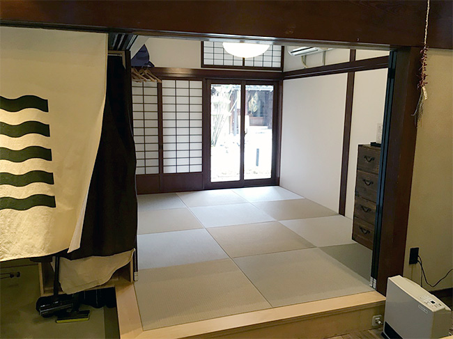 板の間を縁無し畳に模様替えし、素敵な空間が更に、お客様にくつろいでいただける美しい空間に仕上がりました。店主様にも気に入っていただき、時間をかけて細部までこだわり仕上げた甲斐がありました。