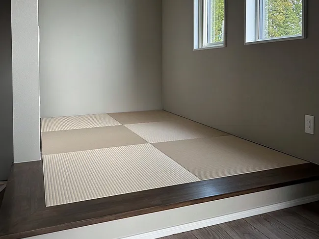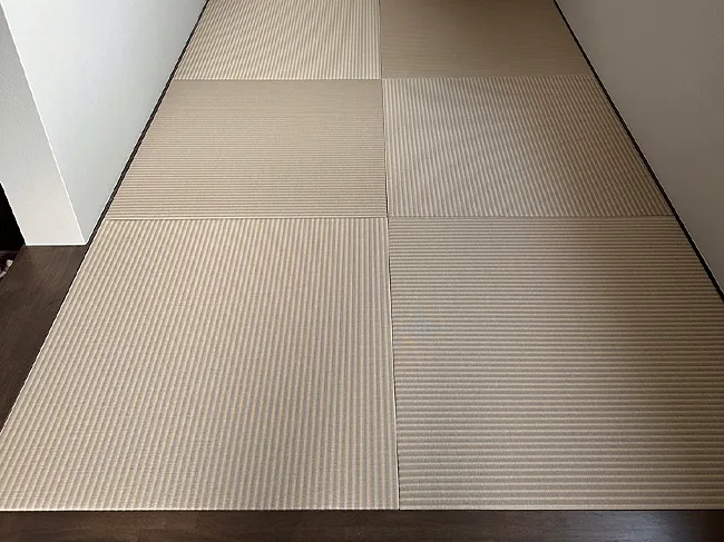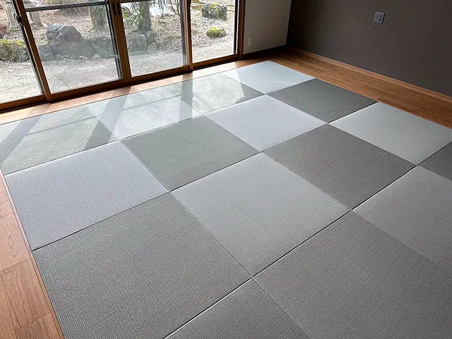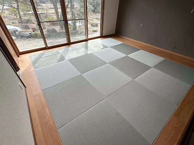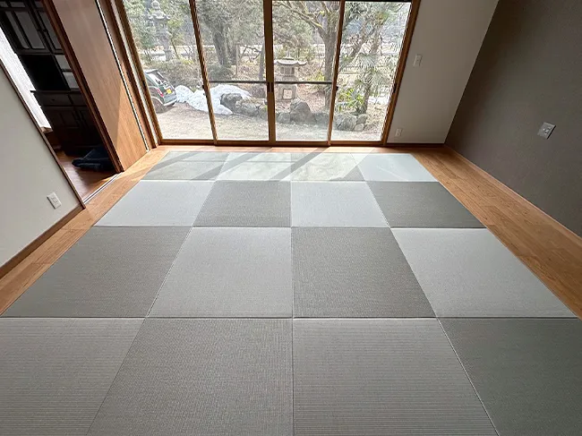 大きな居間を縁無し畳で模様替えさせていただきました。灰桜色