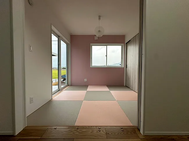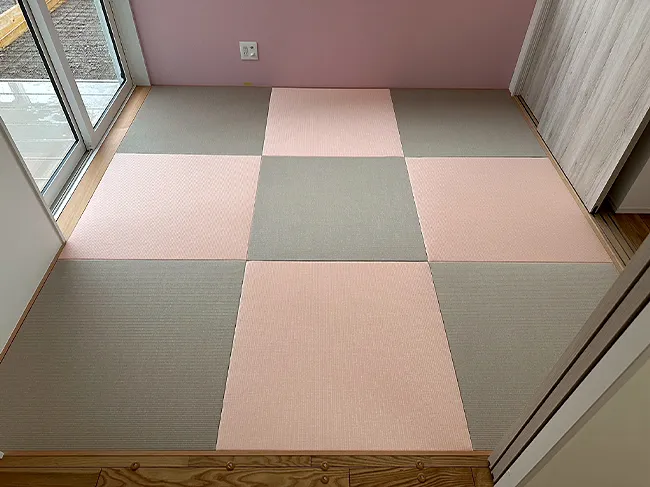 薄桜色と灰桜色の縁無し畳のお部屋。かわいい♡