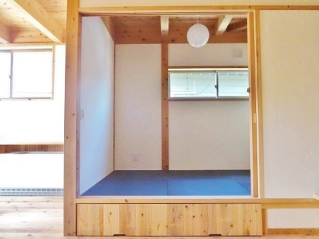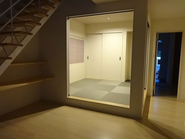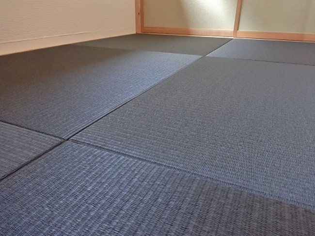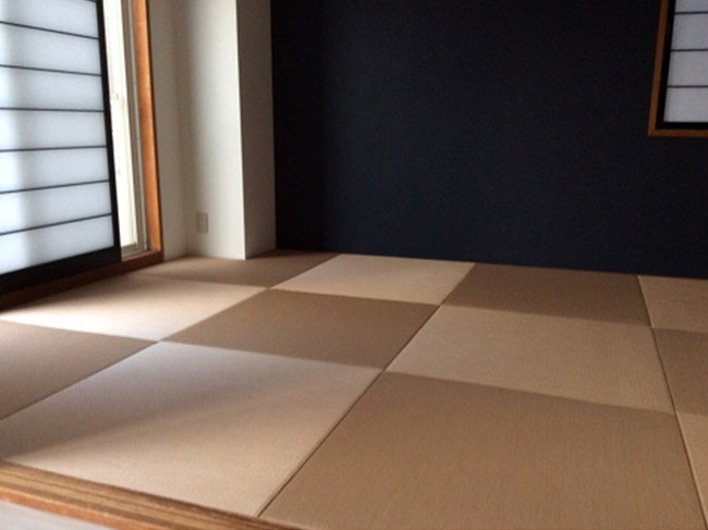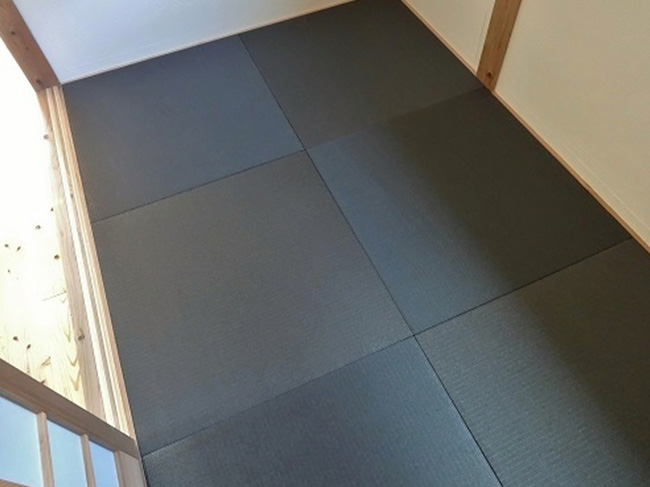 リビングの一角に縁なし畳を納めさせていただきました。墨染め色は黒にほんのり藍が入った色です。