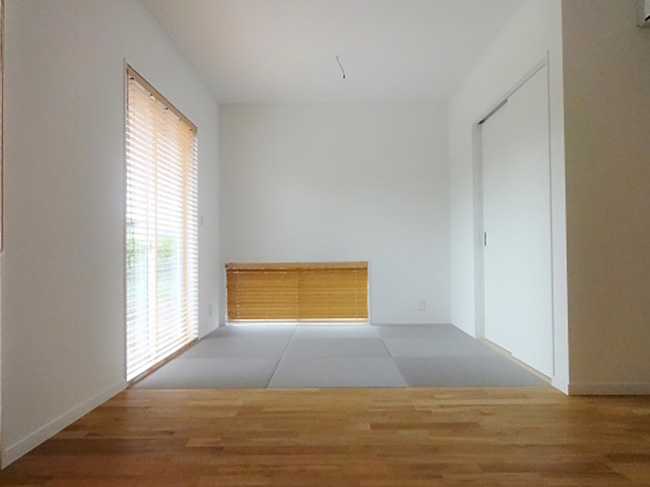 白壁と無垢のフローリングが美しいお部屋に縁なし畳を納めさせていただきました。