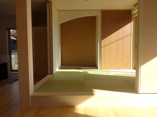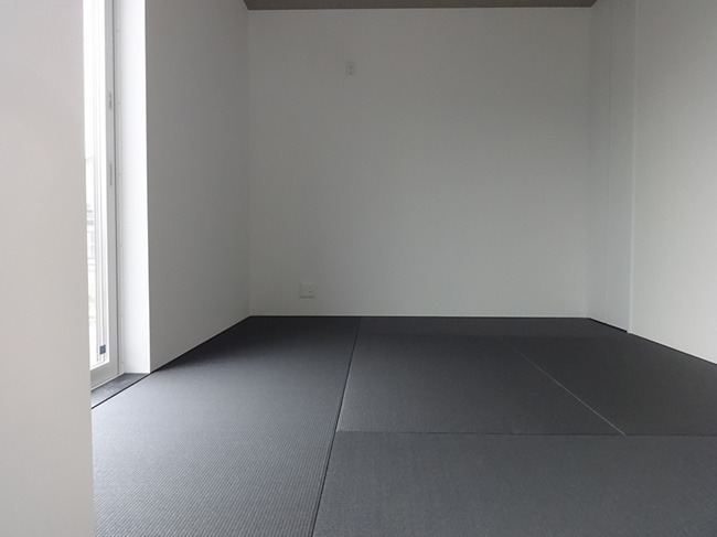 リビングの一角に縁なし畳を納めさせていただきました。墨染め色は黒にほんのり藍が入った色です。