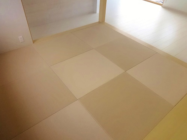 白壁と無垢のフローリングが美しいお部屋に縁なし畳を納めさせていただきました。